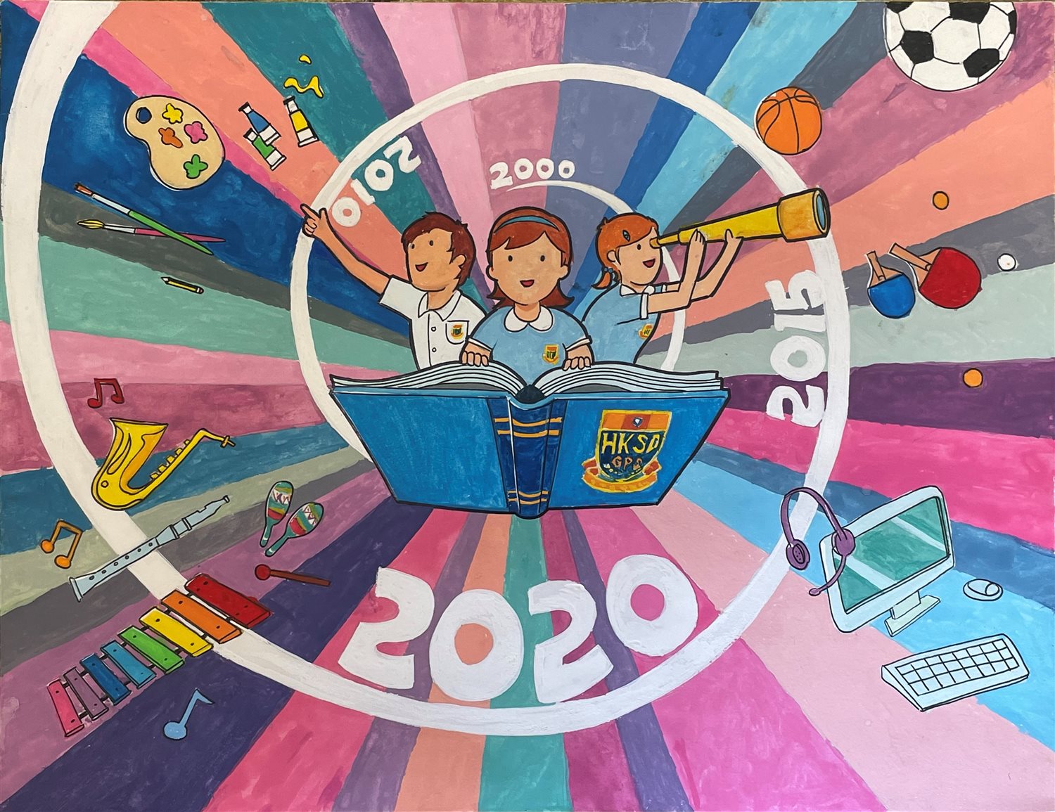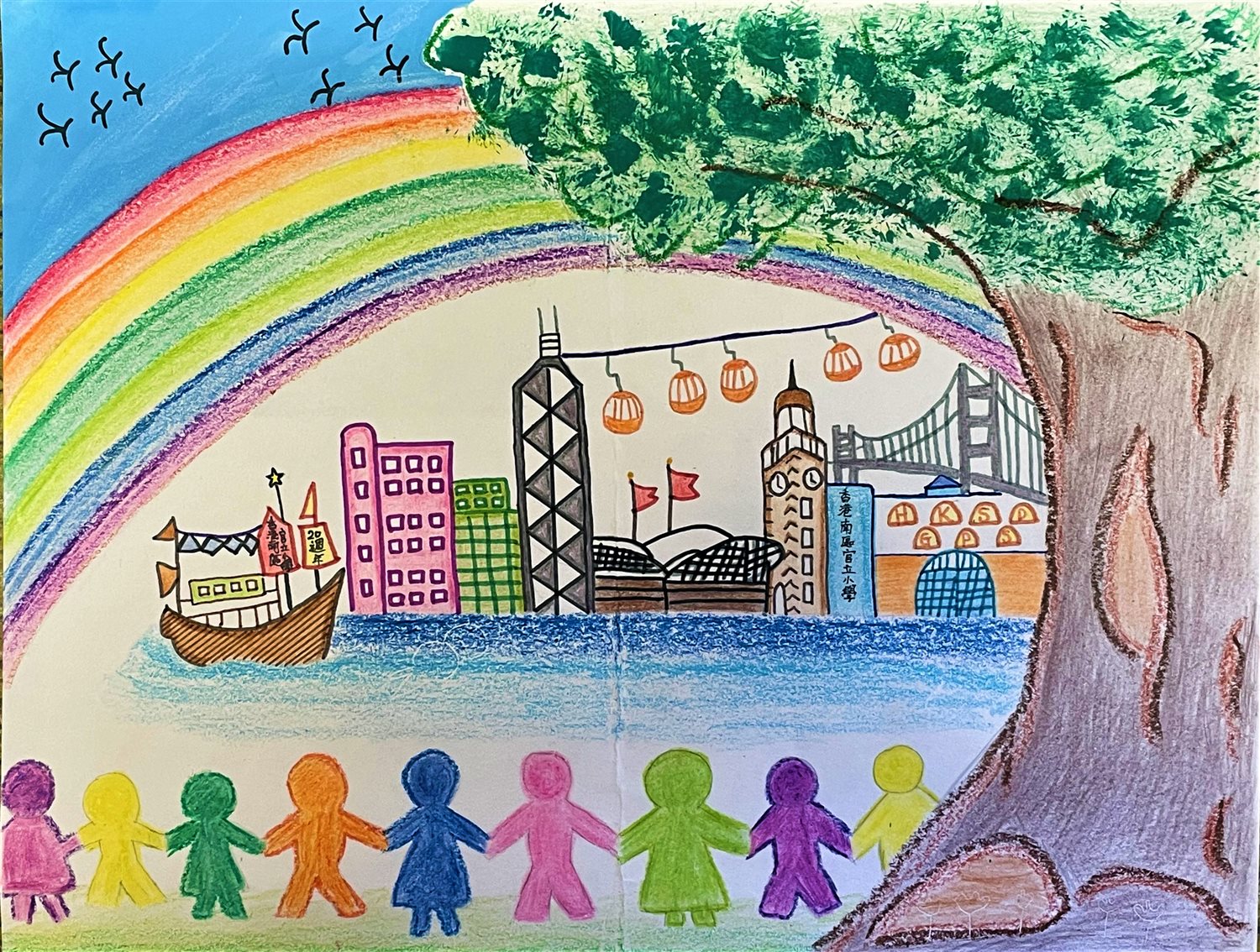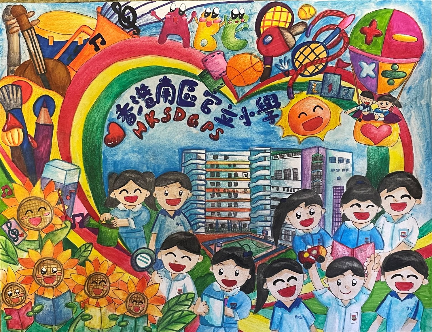 創作概念: 學校的生活多姿多彩,有如天上的彩虹。我們同心合力,創建精彩光輝的未來。