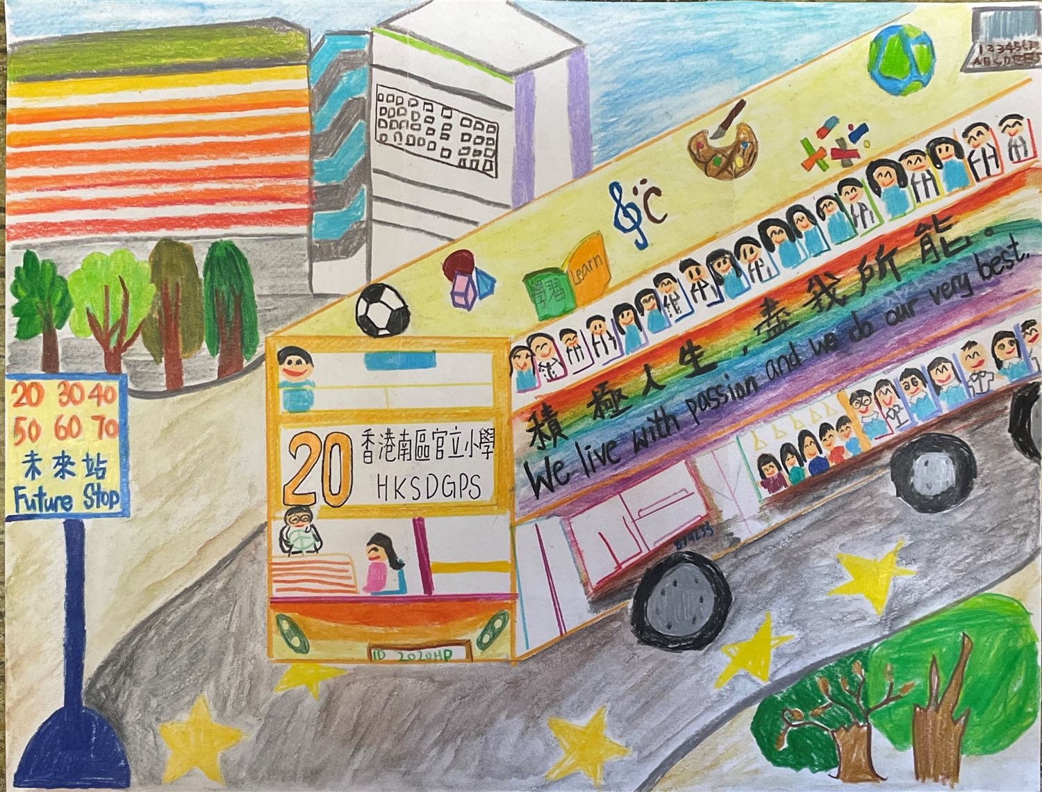 創作概念: 全校師生在往南官未來站的巴士上,以積極正向的心共學共長,展開多元化學習旅程。