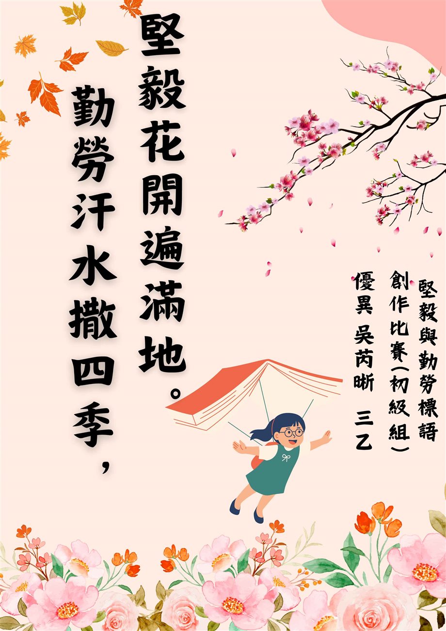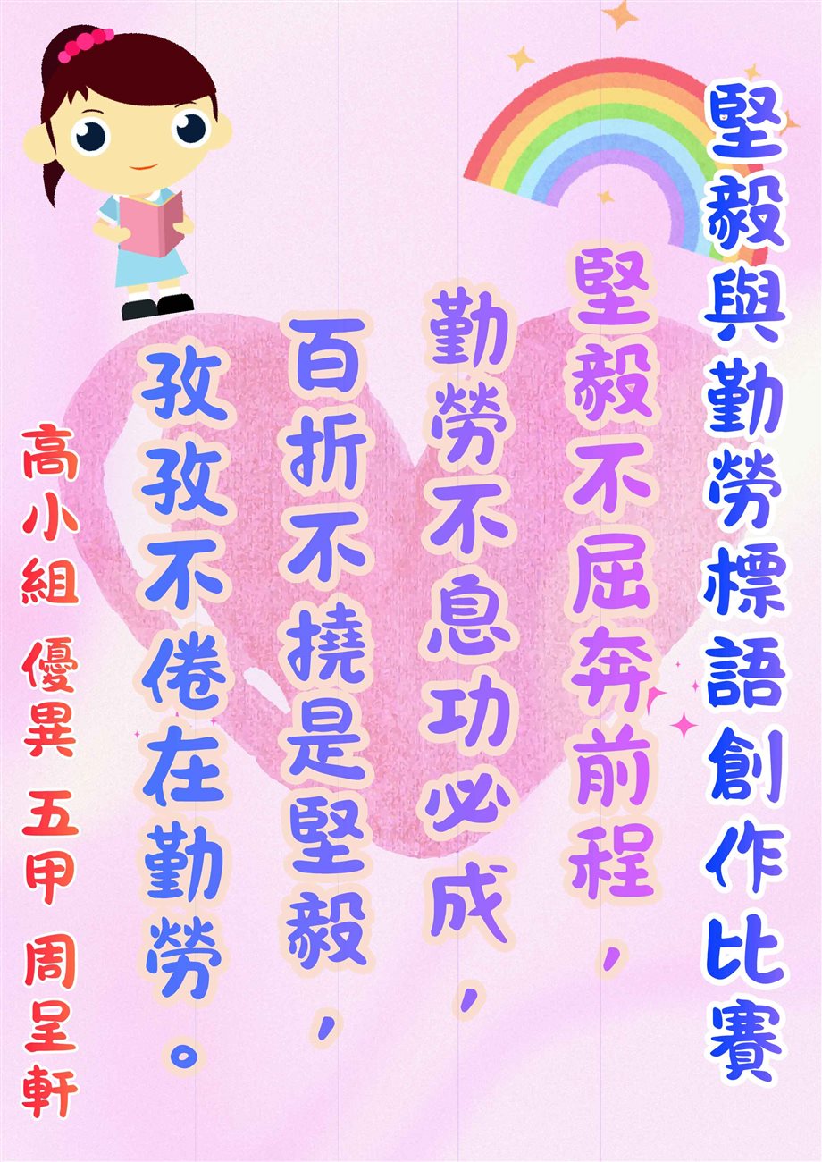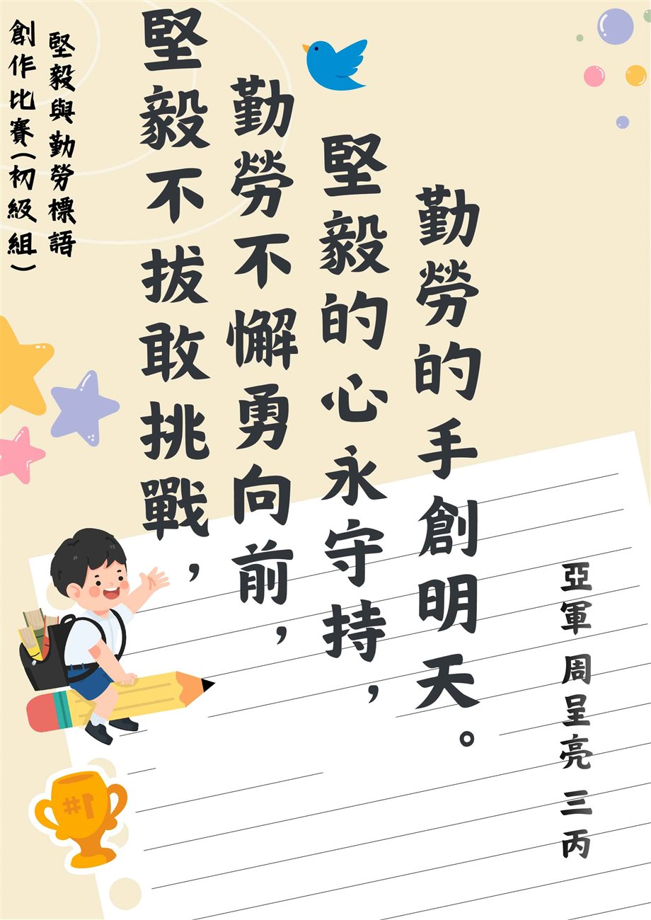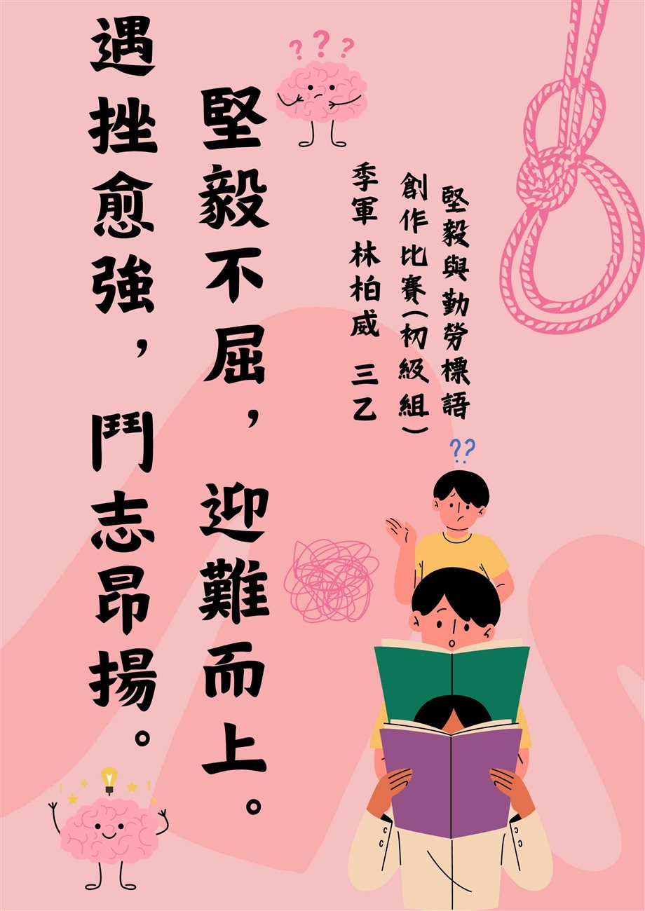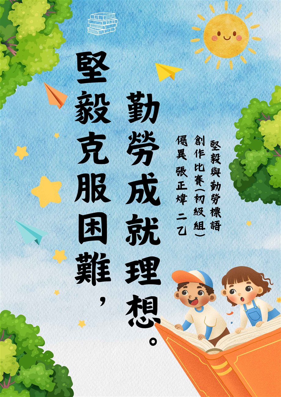 為培養學生的堅毅精神與勤勞態度,本校於10月份舉辦「勤勞與堅毅標語創作比賽」,鼓勵學生發揮創意,透過文字表達正面價值觀,提升語文表達能力及價值觀認知。有關結果如下: