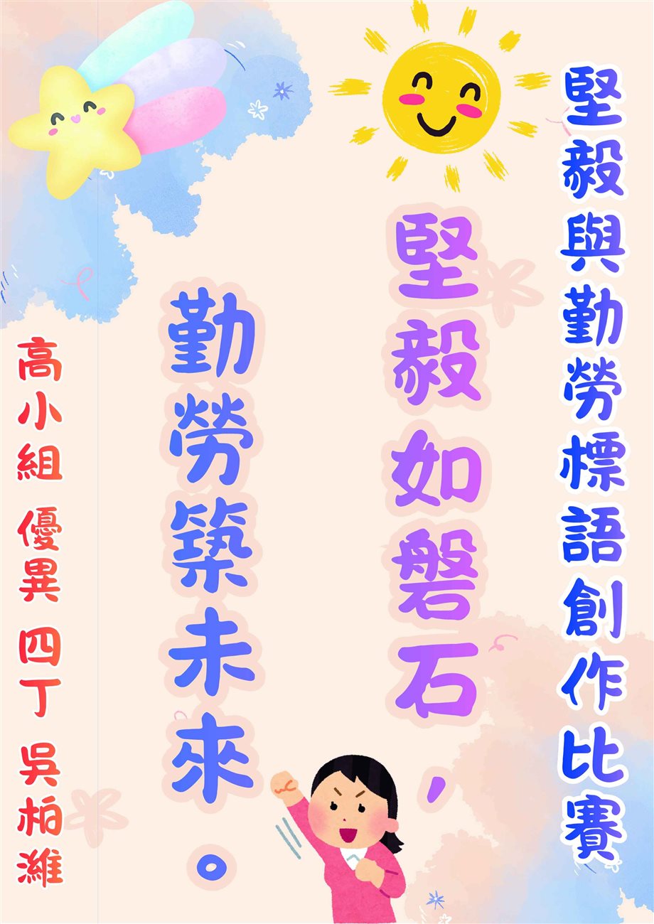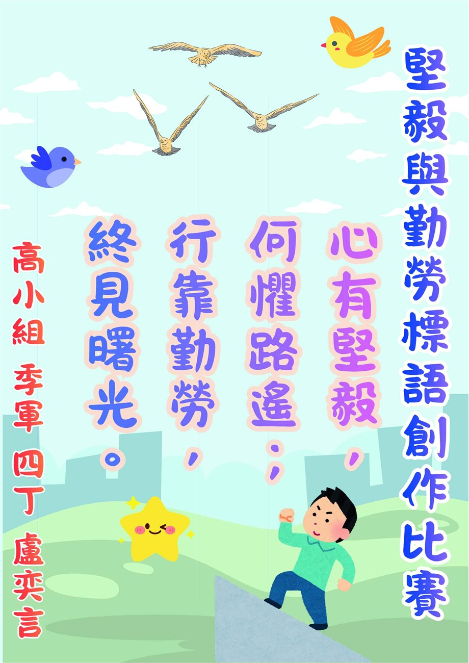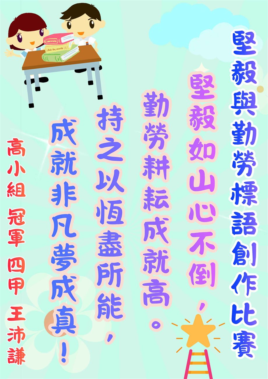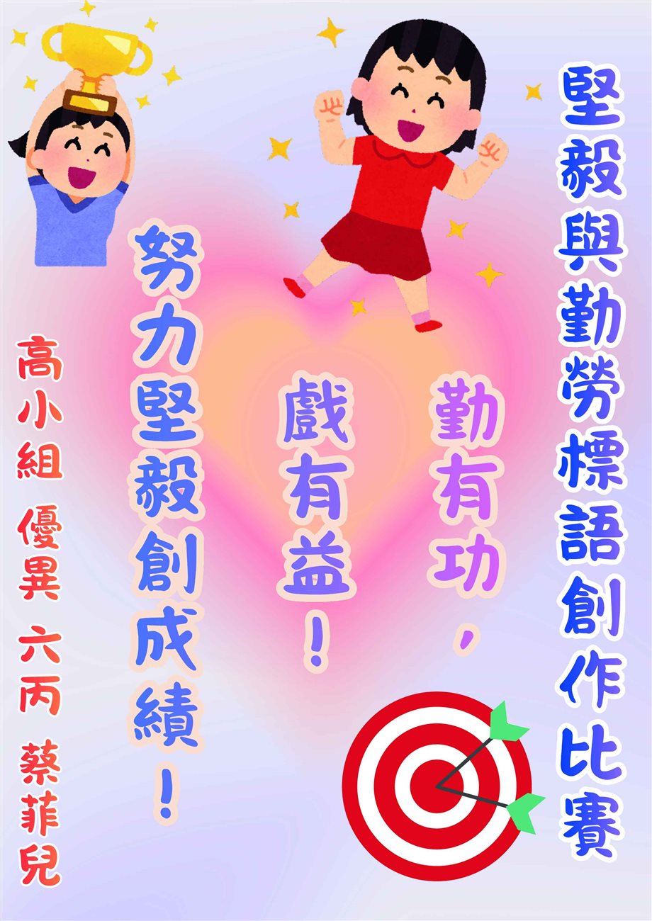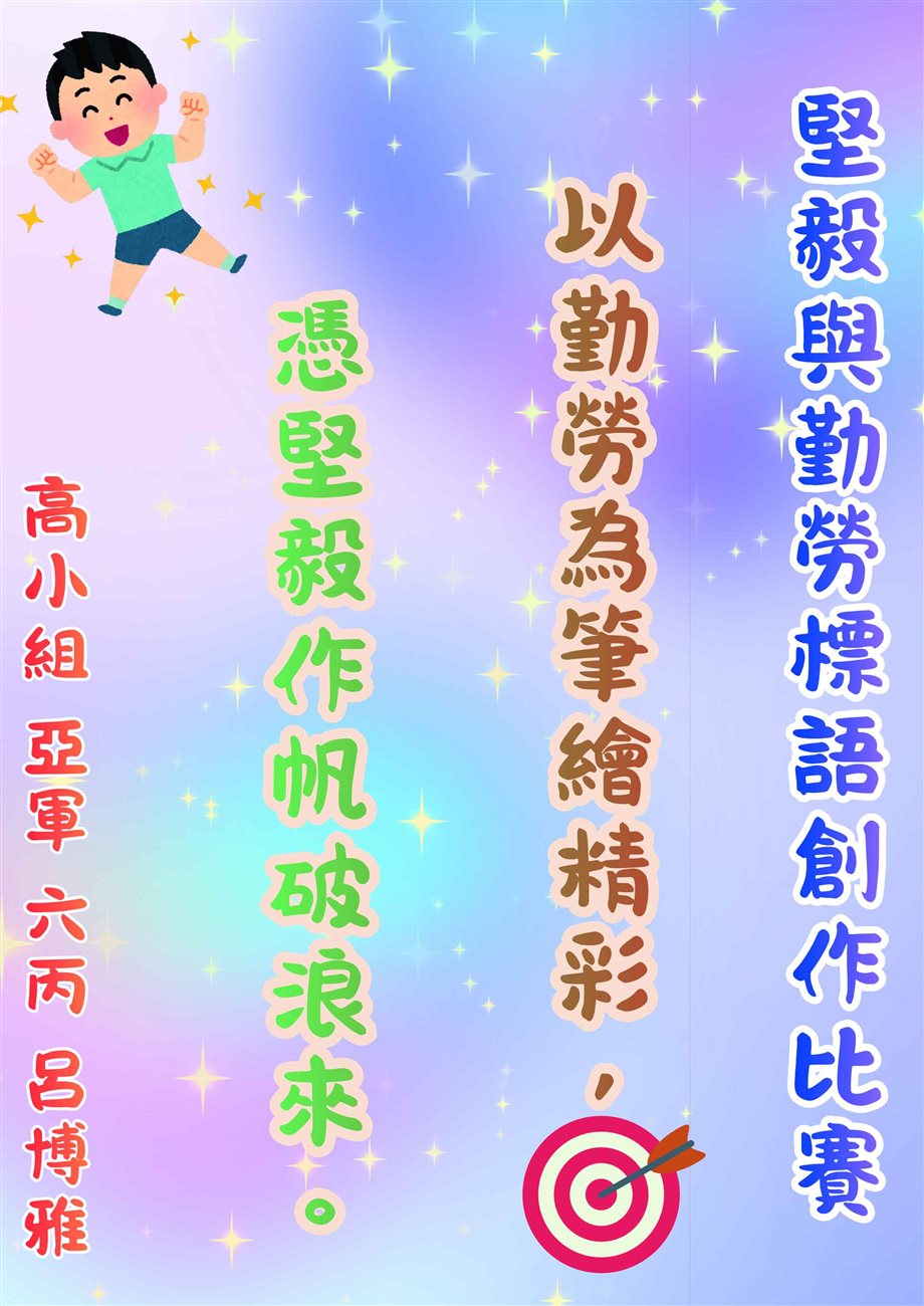 為培養學生的堅毅精神與勤勞態度,本校於10月份舉辦「勤勞與堅毅標語創作比賽」,鼓勵學生發揮創意,透過文字表達正面價值觀,提升語文表達能力及價值觀認知。有關結果如下: