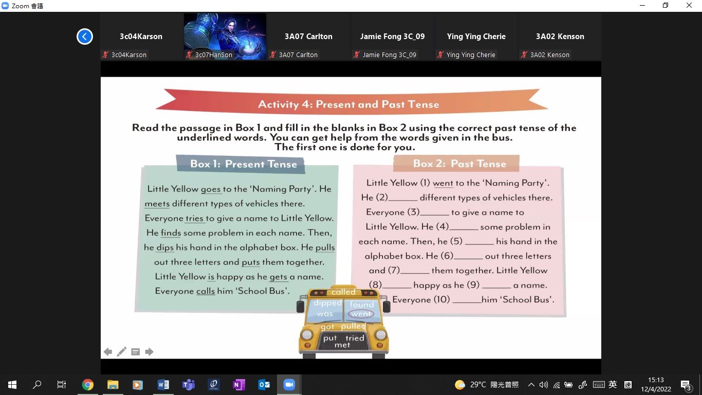 本校於4月份在MS Teams平台為全體三年級同學舉行了由語常會及English Alliance主辦的「Dr Grammar」活動,同學於活動中與外籍英語老師交流,一起閱讀故事,創作故事角色,反應十分踴躍。